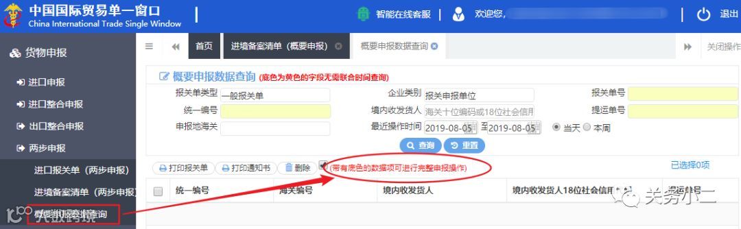单一窗口两步申报中,提供了“概要申报数据查询”功能,根据带有底色的数据项可进行完整申报操作,见下图。