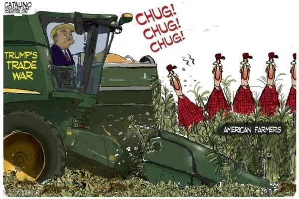 ▲【秋收】特朗普驾驶“贸易战”收割机收获庄稼,在他面前倒下的是一个个美国农民。(《美国新闻与世界报道》周刊网站)