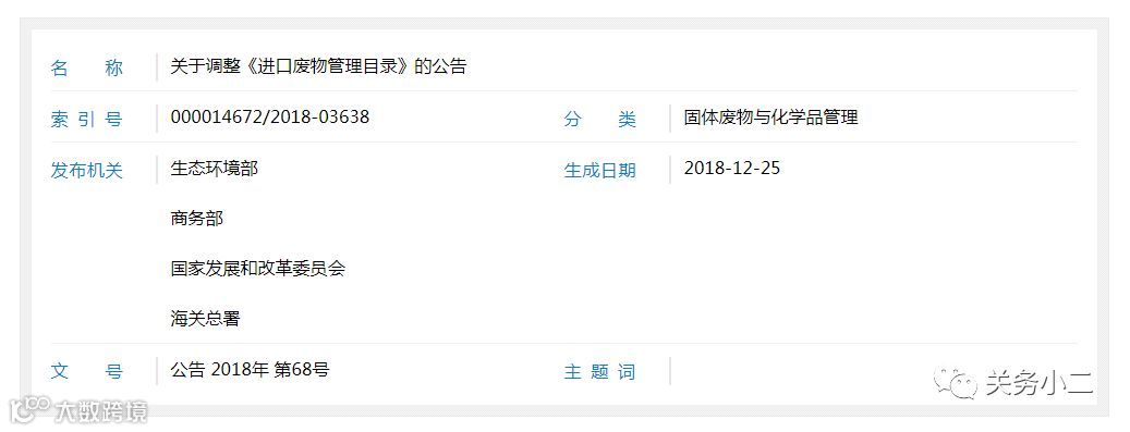 为进一步规范固体废物进口管理,防治环境污染,根据《中华人民共和国固体废物污染环境防治法》《固体废物进口管理办法》及有关法律法规,生态环境部、商务部、发展改革委、海关总署对现行的《非限制进口类可用作原料的固体废物目录》和《限制进口类可用作原料的固体废物目录》进行以下调整: