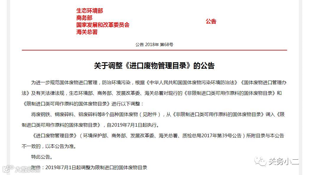将废钢铁、铜废碎料、铝废碎料等8个品种固体废物(见附件),从《非限制进口类可用作原料的固体废物目录》调入《限制进口类可用作原料的固体废物目录》,自2019年7月1日起执行。