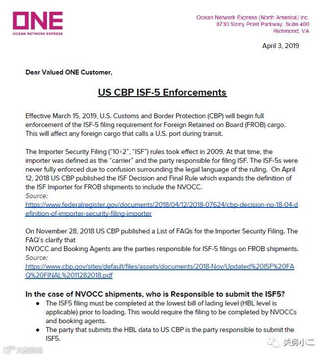2018年11月28日,美国海关和边境保护局(CBP)公布了一份进口安全备案常见问题清单,明确了无船承运人和预订代理为ISF-5申报责任方。