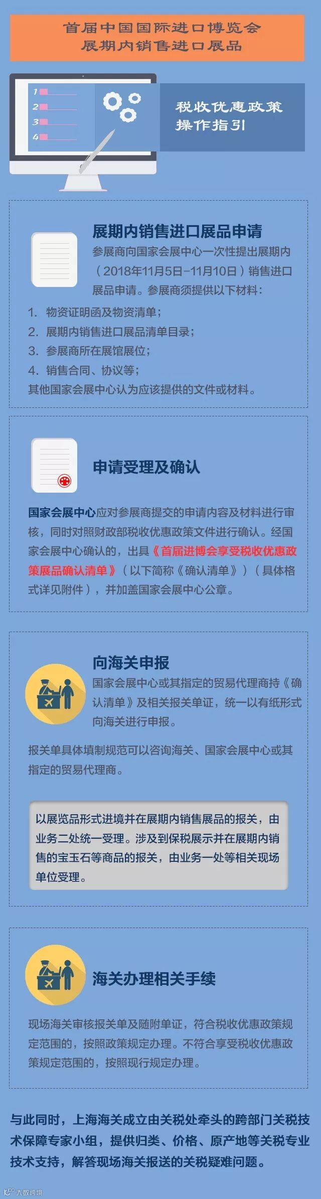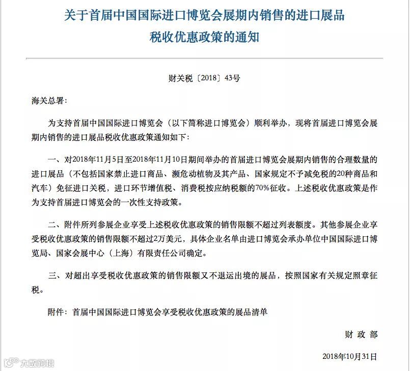 财政部近日发布了《关于首届中国国际进口博览会展期内销售的进口展品税收优惠政策的通知》