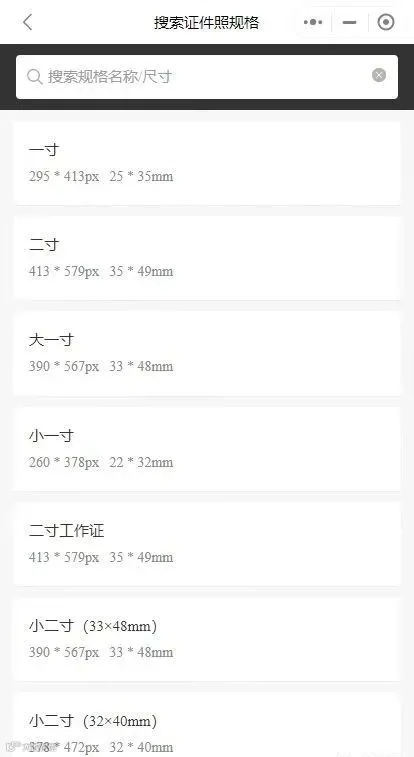 主页面下方为常见的证件照尺寸,选择好尺寸以后点击右下方开始拍摄,或者点击左下方按钮上传已经拍摄好的正面照即可。(可以自拍也可以别人协助拍摄)