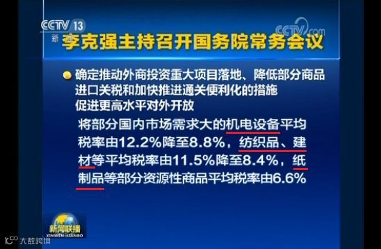 会议决定,适应产业升级、降低企业成本和群众多层次消费等需求,从今年11月1日起,降低1585个税目工业品等商品进口关税税率,将部分国内市场需求大的工程机械、仪器仪表等机电设备平均税率由12.2%降至8.8%,纺织品、建材等商品平均税率由11.5%降至8.4%,纸制品等部分资源性商品及初级加工品平均税率由6.6%降至5.4%,并对同类或相似商品减并税级。至此今年以来已出台降关税措施预计将减轻企业和消费者税负近600亿元,我国关税总水平将由上年的9.8%降至7.5%。