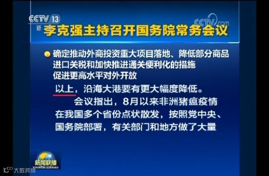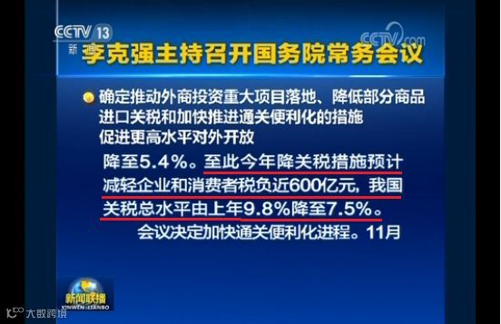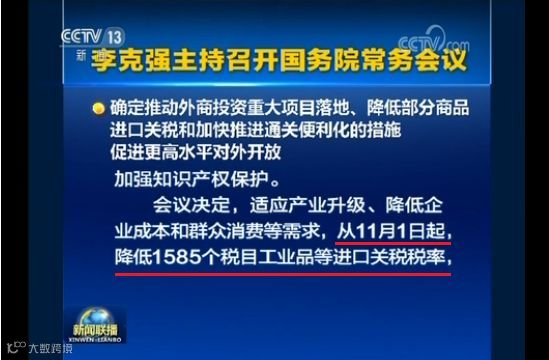 9月26日,国务院召开常务会议,会议决定,从11月1日起降低1585个税目的进口关税税率,关税总水平将从上年的9.8%降至7.5%。