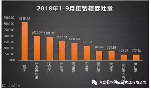 1-9月集装箱吞吐量排名前十的港口:上海港(第1)、宁波舟山港(第2)、深圳港(第3)、广州港(第4)、青岛港(第5)、天津港(第6)、厦门港(第7)、大连港(第8)、苏州港(内河)(第9)、营口港(第10)。