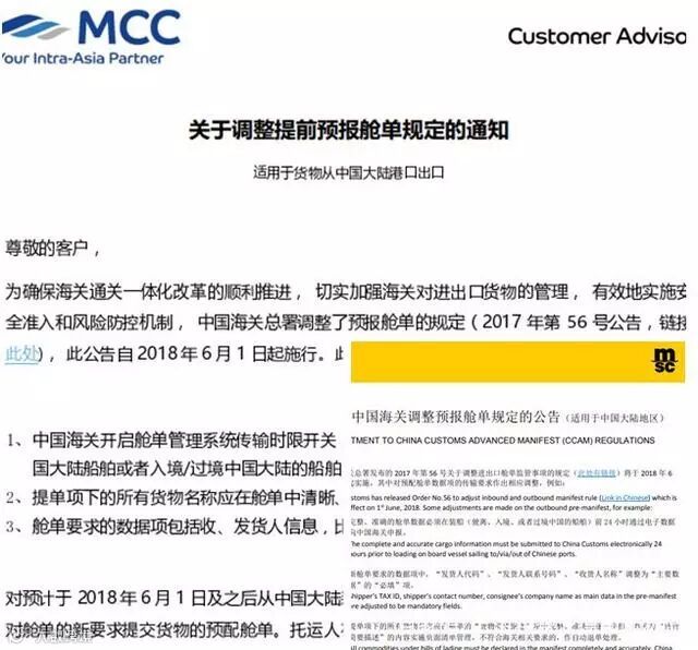 对预计于2018年6月1日及之后从中国大陆装载出口的货物,船公司将遵守中国海关对舱单的新要求提交货物的预配舱单。托运人在向出口地海关申报货物之前,应按照船公司指定船舶代理的要求进行预配舱单的录人。具体海关通知详见文末。