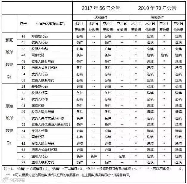 届时,水运、空运舱单数据项传输要求变更,具体如下(现行舱单数据传输要求为2010年第70号公告所制定):