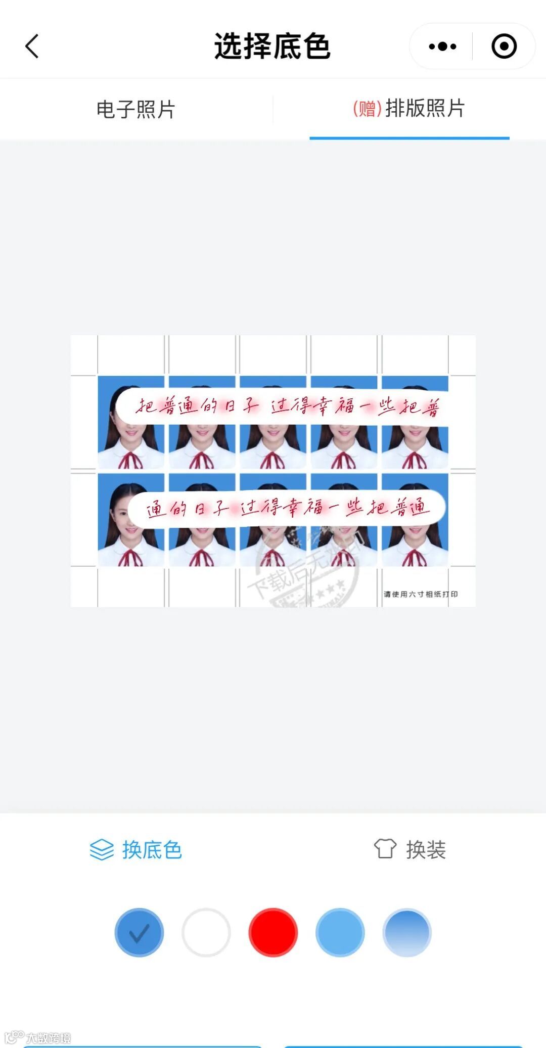 以白色底色换蓝色底色为例如图所示,非常简单。如果需要打印,还附赠排版照片功能。