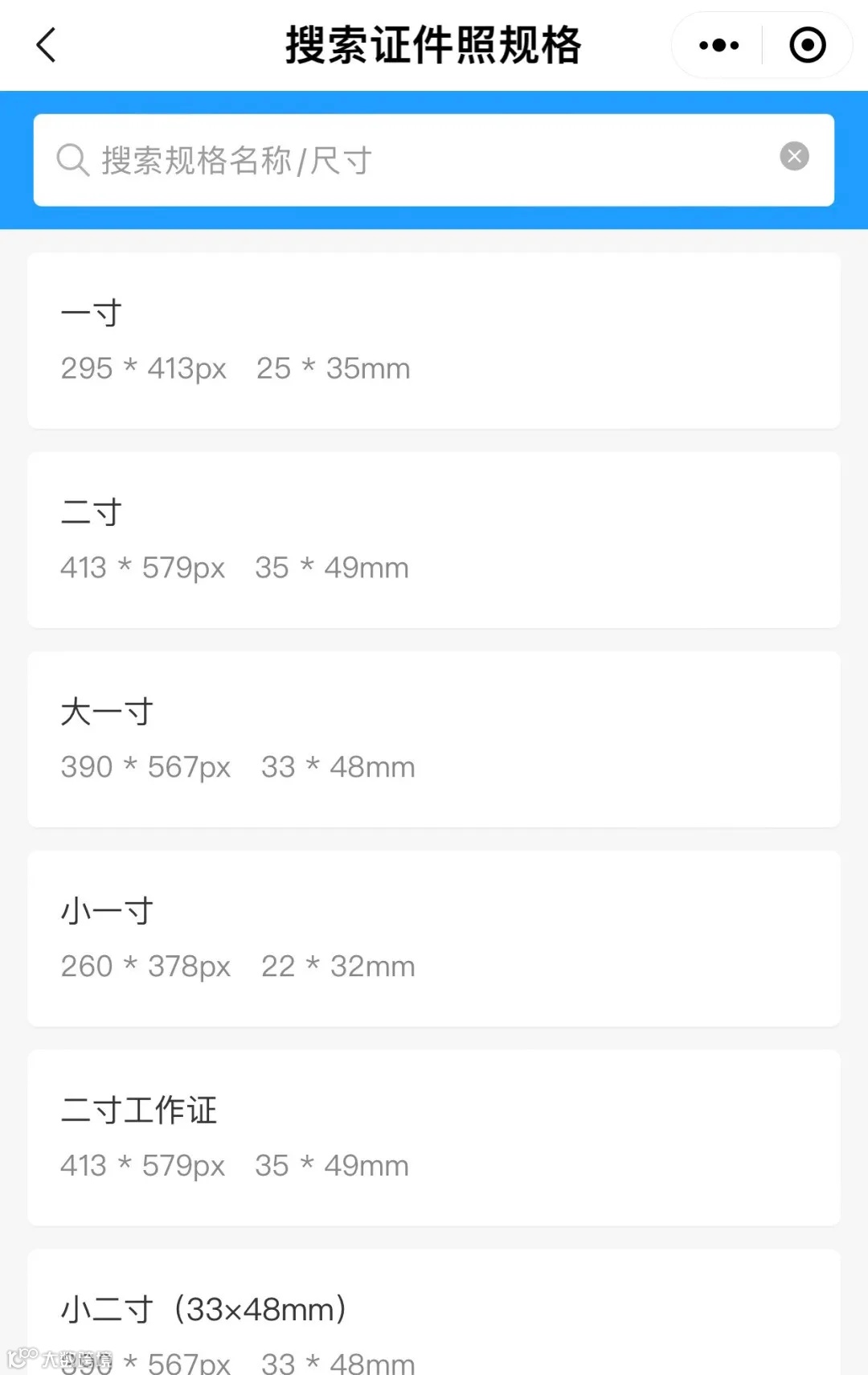 除了常用的9种尺寸以外,点击主页面常用尺寸右边的更多分类,可以进入搜索页面,输入你需要的类型点击放大镜,系统会自动根据地区和类别出现很多选项,点击进入进行拍摄,拍好以后,进行后期制作,做好以后保存照片即可。