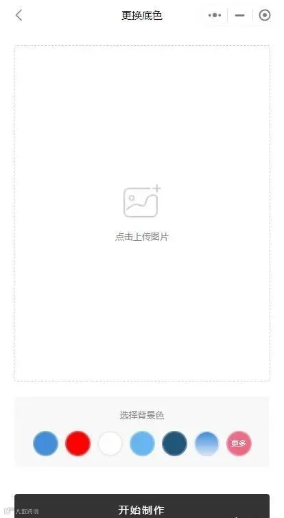 主页面下方为常见的证件照尺寸,选择好尺寸以后点击右下方开始拍摄,或者点击左下方按钮上传已经拍摄好的正面照即可。(可以自拍也可以别人协助拍摄)