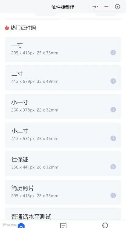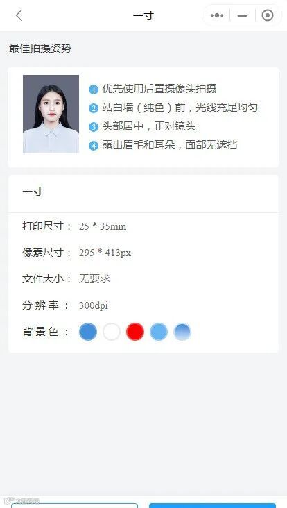 选择热门证件照下方的常见尺寸选项,小程序经过筛选,提供了9种常见证件照尺寸,可以一键快捷选择。点击“一寸”证件照选项,则会出现“一寸”的证件照制作页面,会提供【最佳拍摄姿势】、【打印尺寸】、【像素尺寸】、【文件大小】、【分辨率】等有关一寸照片的属性信息,您可以选择自己需要的【背景色】,点击换装,最后系统自动制作,保存即可。