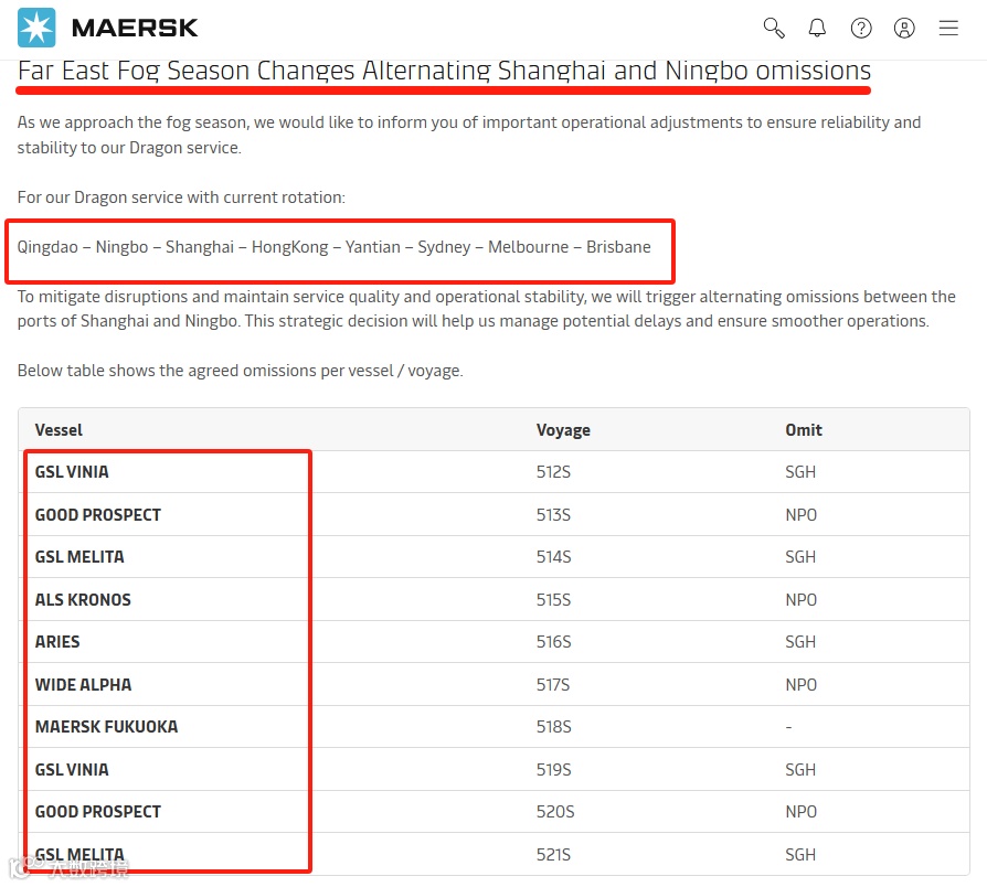 公告指出,为了减少天气因素带来的干扰,并维持服务质量与运营稳定性,马士基决定在Dragon航线上实施上海港和宁波港之间的“交替跳港”策略。这意味着在某些航次中,将交替取消挂靠上海港或宁波港,以有效管理潜在的延误,保障航线运营的顺畅。