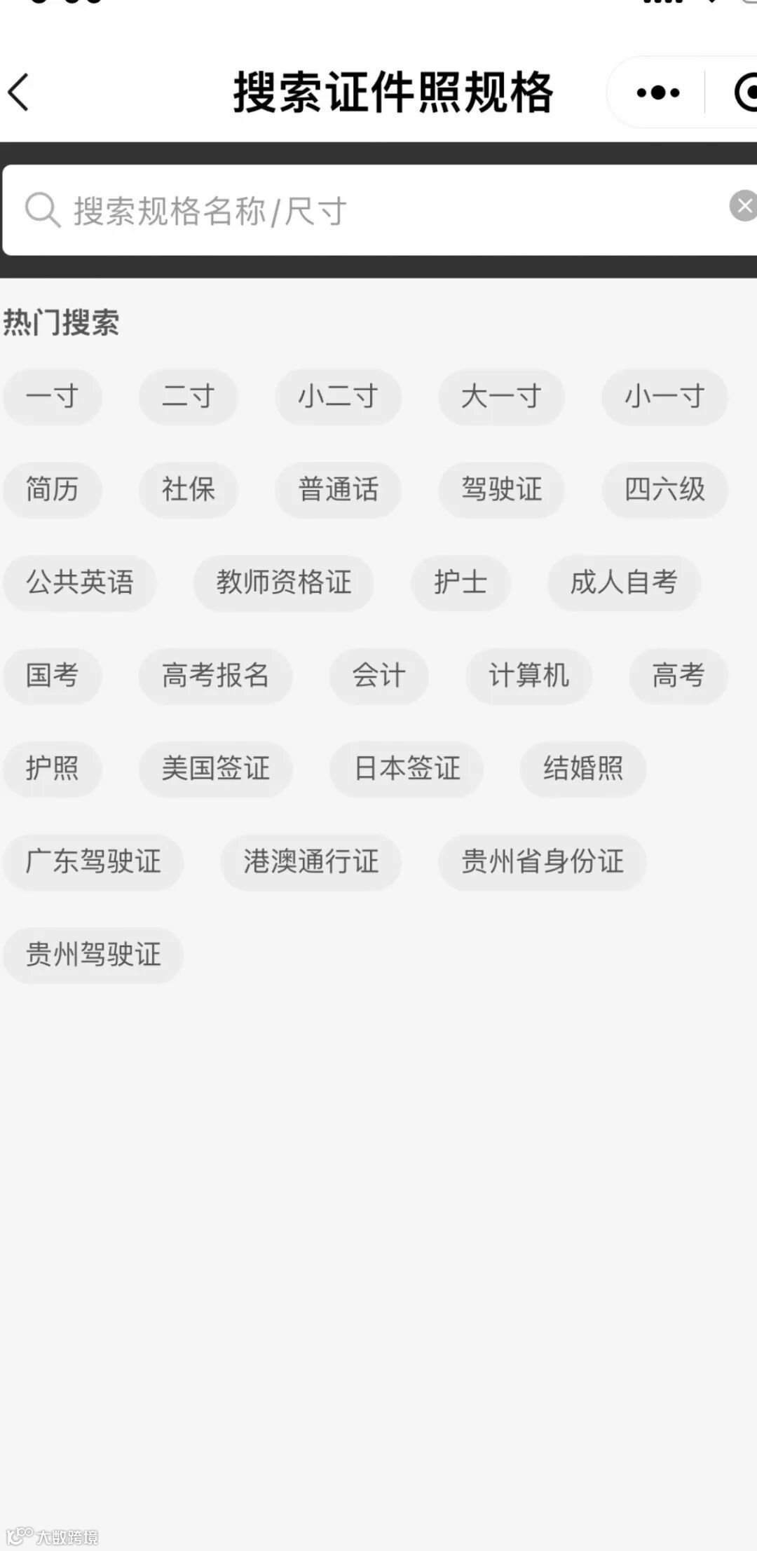 除了常用的9种尺寸以外,点击主页面常用尺寸右边的更多分类,可以进入搜索页面,输入你需要的类型点击放大镜,系统会自动根据地区和类别出现很多选项,点击进入进行拍摄,拍好以后,进行后期制作,做好以后保存照片即可。