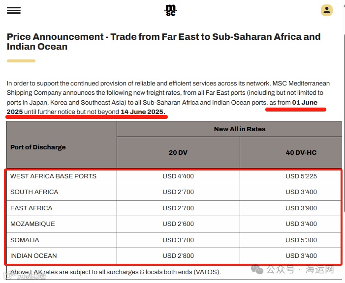 MSC上调远东到撒哈拉以南非洲和印度洋的FAK费率