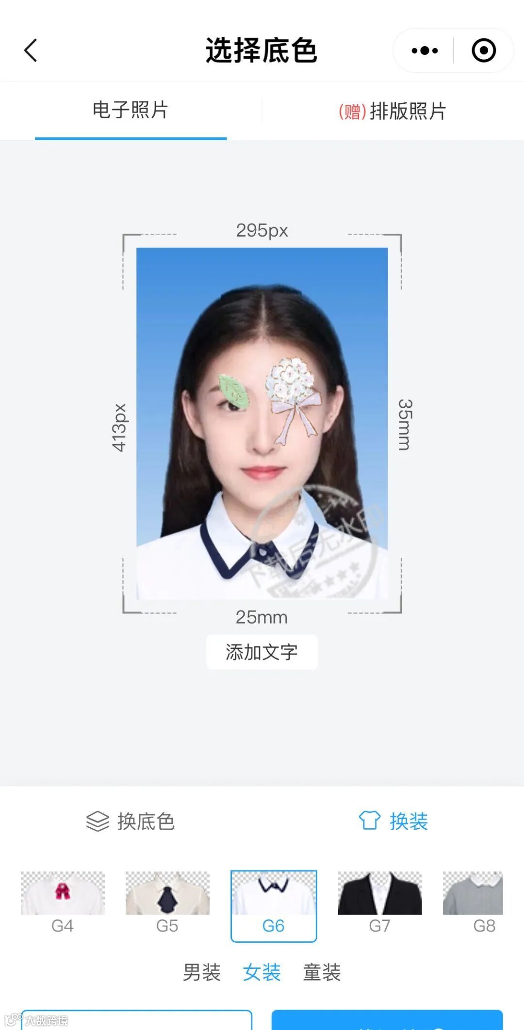 如果需要拍摄职业装照片,来不及换职业装,或者根本没有合适的服装,没关系哦,这里有一键换装功能,选择好尺寸和底色拍摄好照片以后,有一个换装功能,点击进入,男装、女装、童装几十款服装可供选择。(对已有的照片也可以换装操作)