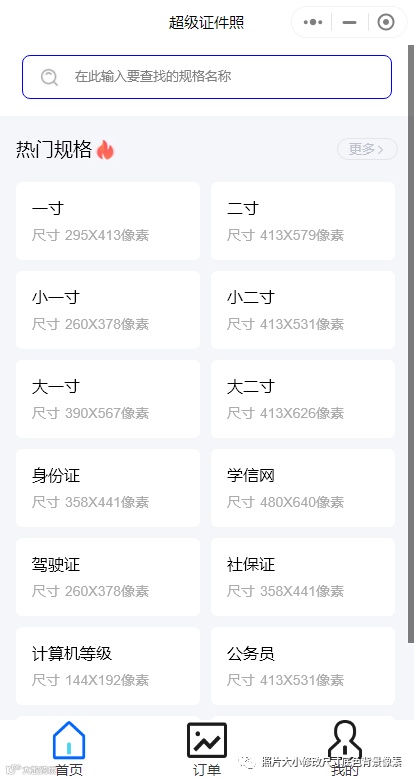 进入小程序,使用搜索功能,可以根据规格名称如: ***考试,一寸;像素大小如: 295; 尺寸大小如: 35; 文件大小如: 100,进行搜索,若找不到您想要的规格,请联系客服。