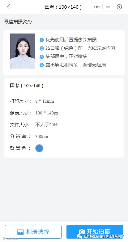 其实照片要求文字描述看起来很严格,实际上只要是免冠白底不模糊的普通电子证件照片基本就可以使用。手头没有的话可以用别的底色的证件照转换,不用去照相馆,省时间又省钱。ps操作有些复杂,软件小白可能不好操作,而打着使用简单功能丰富的美颜相机软件专业度太低,推荐使用专业的证件照拍摄软件,比如证件照制作小程序,操作简单,功能齐全,专门为证件照制造拍摄而设计,专业度有保障,快来看看吧!