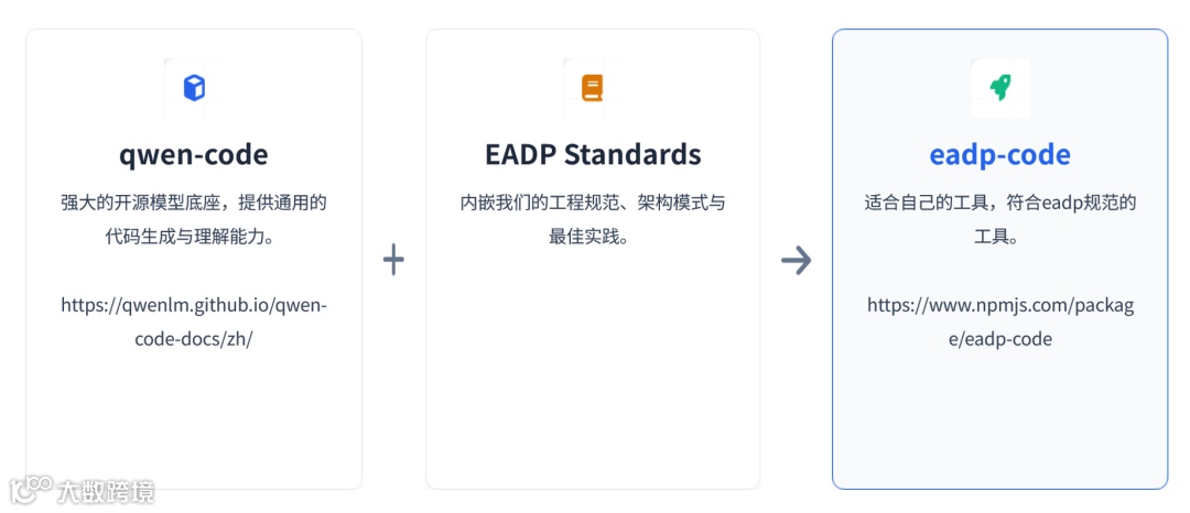 eadp-code并非通用型代码工具,而是深度贴合虹信软件企业应用开发平台(EADP)工程规范、架构模式与最佳实践的定制化解决方案。它以开源模型qwen-code为底座,融合虹信软件多年来所沉淀的工程规范、架构模式与最佳实践等技术经验,实现“通用能力+专属规范”的双重赋能,有效破解通用AI工具与企业内部体系脱节的核心痛点。
