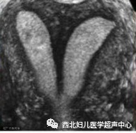 不全纵隔是一种子宫先天性发育畸形,它是两侧副中肾管部分为融合形成的。不全纵隔是一部分由宫底向宫腔延伸的肌性组织,将部分宫腔分为两部分,在妊娠后羊水绕过纵隔形成的宫内带状结构。因为纵隔为肌性组织,所以带状回声较宽、回声低,两侧基底与子宫肌层相连。