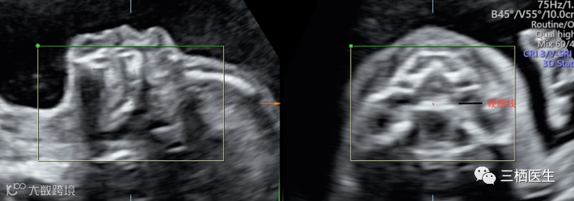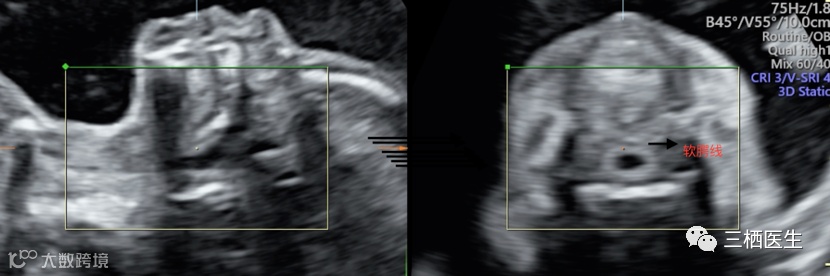 平时的筛查中,胎儿面朝探头时我们会常规扫查牙槽骨,此时略微倾斜探头即能找到硬腭线,继而软腭线,最后悬雍垂。