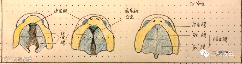 胚胎时期调控因素很多,精细而复杂。对于超声诊断,需要知道经典的唇腭裂发生有一个节点——最早融合点,它能帮助我们知道诊断思路,下面是一张简化的手工图: