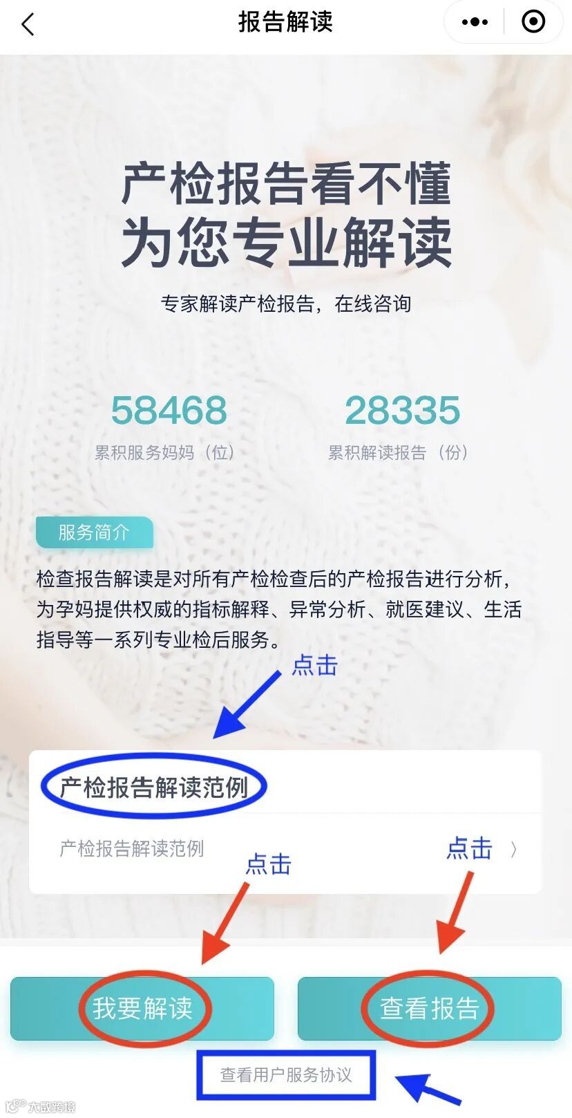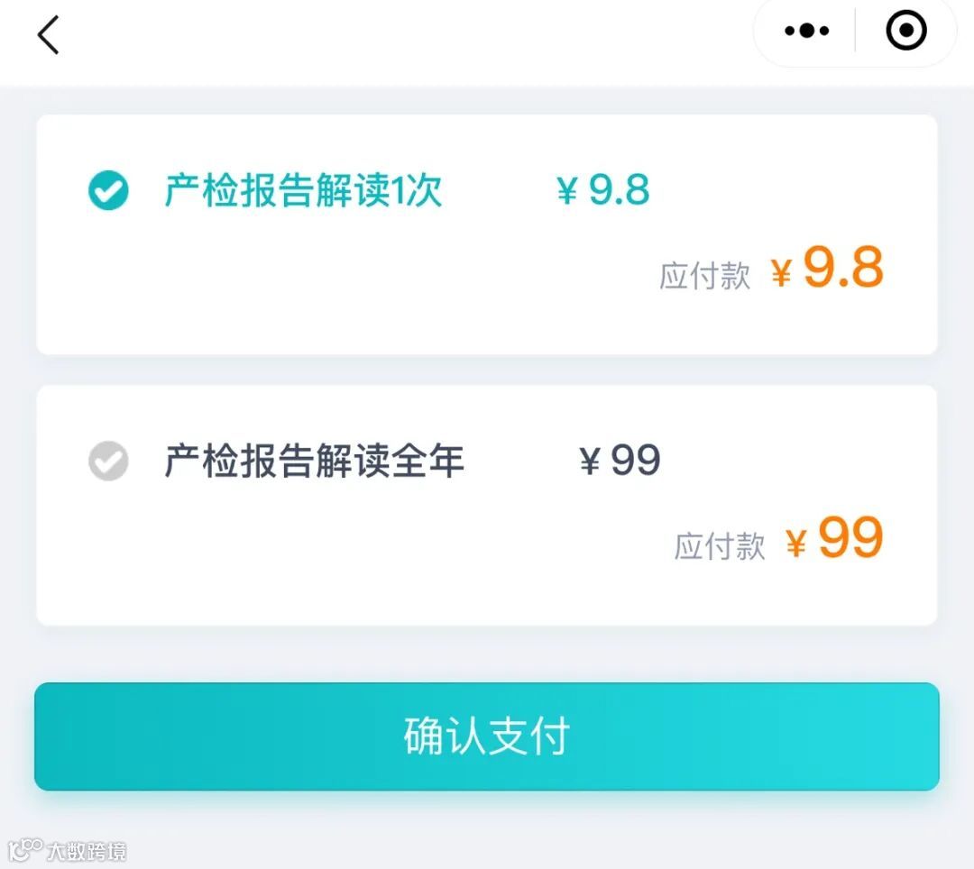 解读报告目前有两个模式,妈妈们可以选择解读一次产检报告(9.8元/次),也可以选择产检报告解读全年(99元/年)。