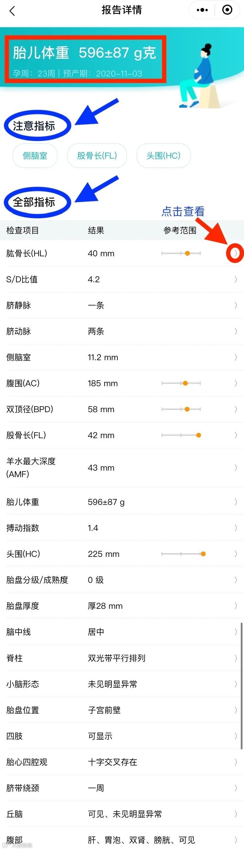 “全部指标”则是罗列了一共27项产检指标——包括肱骨长(HL)、S/D比值、脐静脉、侧脑室等等。每一项右侧的箭头都可以点击进入,了解到每一项指标的具体解读。