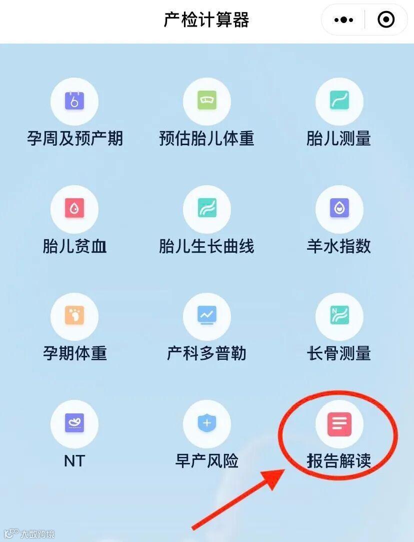 妈妈们可以选择扫描下方的维码,直接进入到小程序的解读页面,或者打开“产检计算器”小程序(点击进入),在主界面找到“报告解读”功能,点击进入。