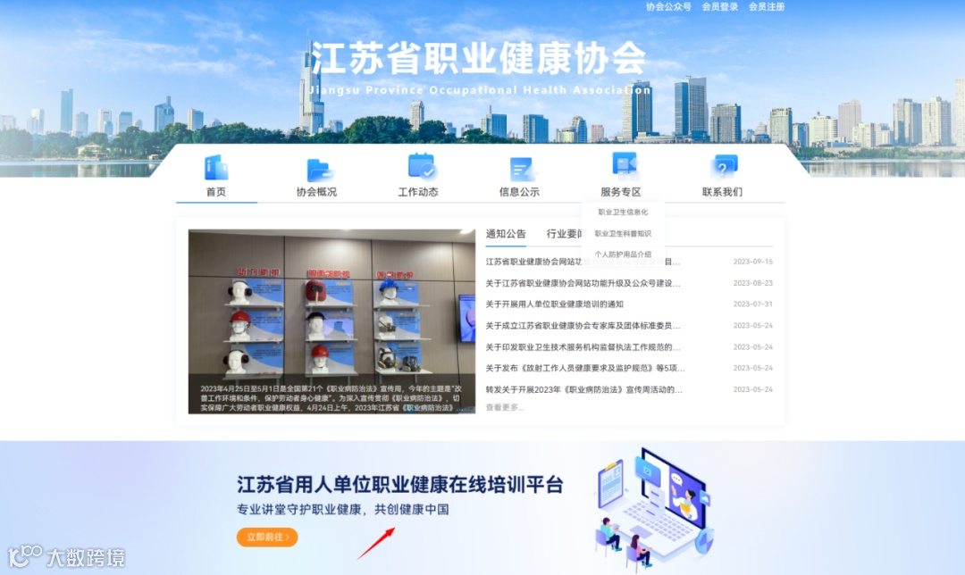 打开江苏省职业健康协会官网(http://47.99.129.91/#/home),点击中间“江苏省用人单位职业健康在线培训平台”进入。
