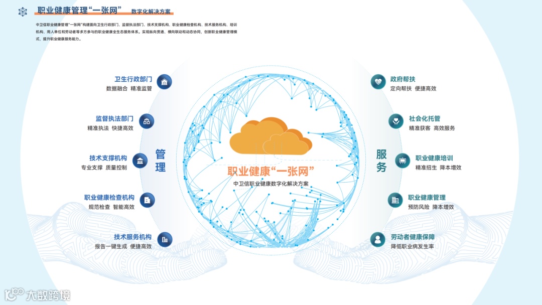 通过中卫信职业健康管理“一张网”数字化解决方案构建了面向卫生行政部门、监督执法部门、技术支撑机构、职业健康检查机构、技术服务机构、培训机构、用人单位和劳动者等多方参与的职业健康全生态服务体系。实现纵向贯通、横向联动和动态协同,创新职业健康管理模式,提升职业健康服务能力。