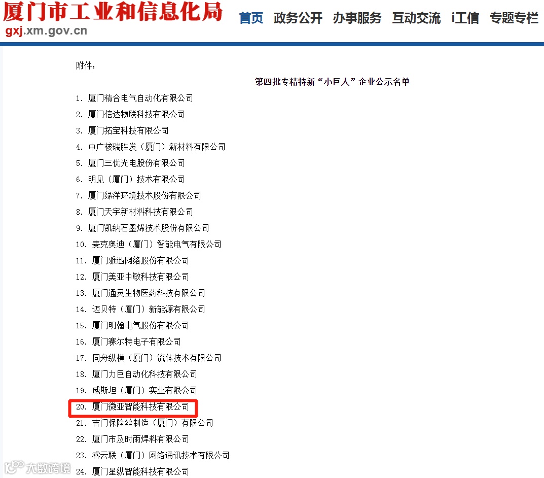 日前,厦门市工业和信息化局官网公示了第四批国家级专精特新“小巨人”企业和第一批专精特新“小巨人” 复核通过企业名单。其中,厦门微亚智能科技有限公司(以下简称“微亚科技”)名列其中。