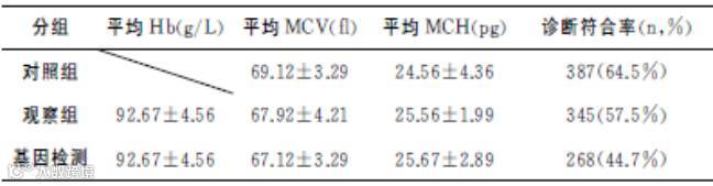 观察组:继MCV、MCH的检验,对MCV<80fl、MCH<27pg的受检者进一步行血红蛋白电泳检测,使用全自动血红蛋白电泳仪(上海艾测电子科技有限公司)检测,检查结果异常:HbA2含量不在2.5%~3.5%,或有异常区带出现(HBH、HBF、HB-Bart’s等),记为地贫患者。可有效分型,α-地贫阳性:HbA2<2.5%,或出现异常血红蛋白(如HBH、Hb-Bart’s);β-地贫阳性:HbA2>3.5%,或区带异常血红蛋白增多(如HbF>2%);β-地贫进一步确认是否存在α-复合β地贫。最后对血红蛋白电泳异常的患者行基因诊断。