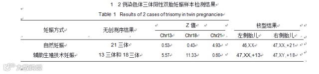 2、120 例双胎妊娠样本中,一共检出 2 例染色体三体阳性样本,阳性率约为 1.7%,其中一例为自然妊娠,测序结果为 21 三体阳性;另一例为辅助生殖技术植入的样本,测序结果为 13 三体和 18 三体阳性。阳性检出结果与后续的核型分析结果一致,具体情况见表 1。另外,病例跟踪结果显示,本次研究所检测的阴性样本中未出现假阴性的案例。