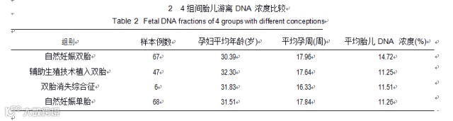 7、测序数据经去低质量、去重复、GC 校正等处理后,根据类似文献报道的方法分别计算出 13 号染色体,18 号染色体和 21 号染色体的 Z 值,并以 Z 值>3 判断为该染色体三体阳性。根据 Y 染色体唯一比对条数进行胎儿游离 DNA 浓度计算。采用 SPSS 19.0 软件进行结果统计,运用单因素方差分析比较自然妊娠双胎组、辅助生殖技术植入的双胎组、双胎消失综合征组和单胎妊娠组 4 组间胎儿游离 DNA 浓度、孕周、孕妇年龄和 Z 值的差异,P<0.05 为差异有统计学意义。