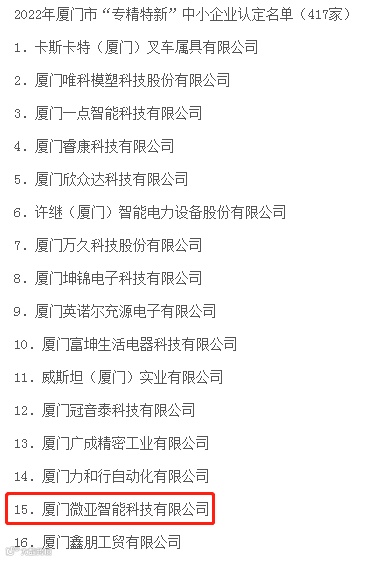 导读:厦门微亚智能科技以高分通过厦门市工业和信息化局关于2022年厦门市“专精特新”中小企业的资格认定