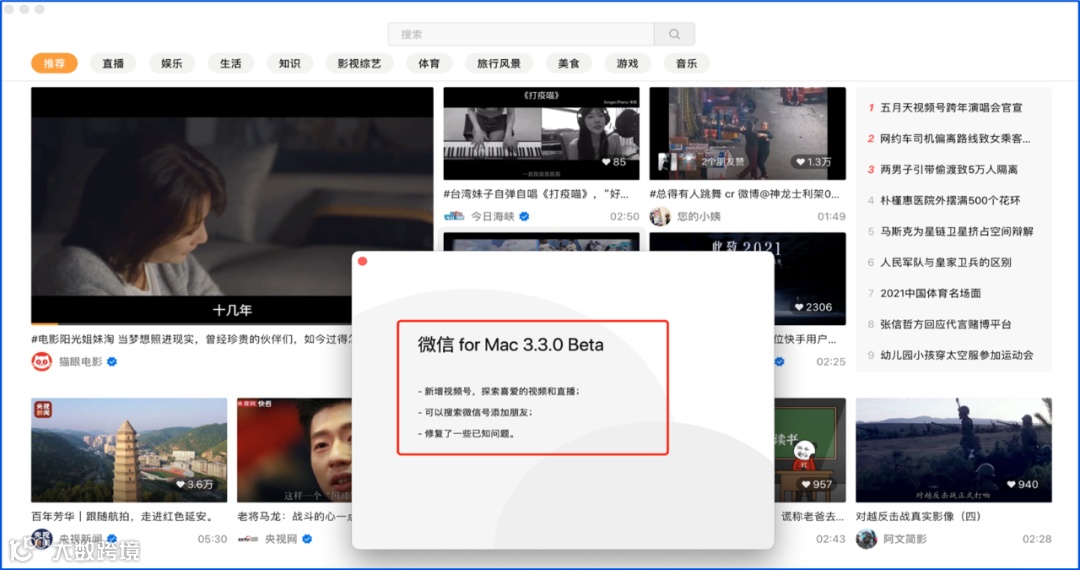 MAC版本的视频号开始变的越来越像一个PC网站,打开网站就可以直接观看各类视频,还有热搜排行榜。