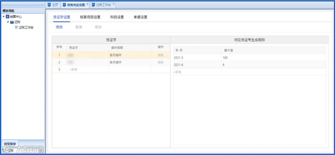用户根据自身企业的财务记账要求,为不同业务对象设置对应的凭证字。凭证字对应凭证号的生成起始于最大值(即在业务系统过账后起始凭证号的值),支持可按年或按月进行循环生成。