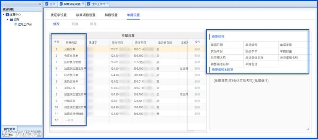 根据财务记账要求,在系统上设置凭证字、核算项目和科目明细,并预设好各业务单据的过账条件,最后对业务系统的单据进行批量过账,智能生成财务记账所需的凭证。