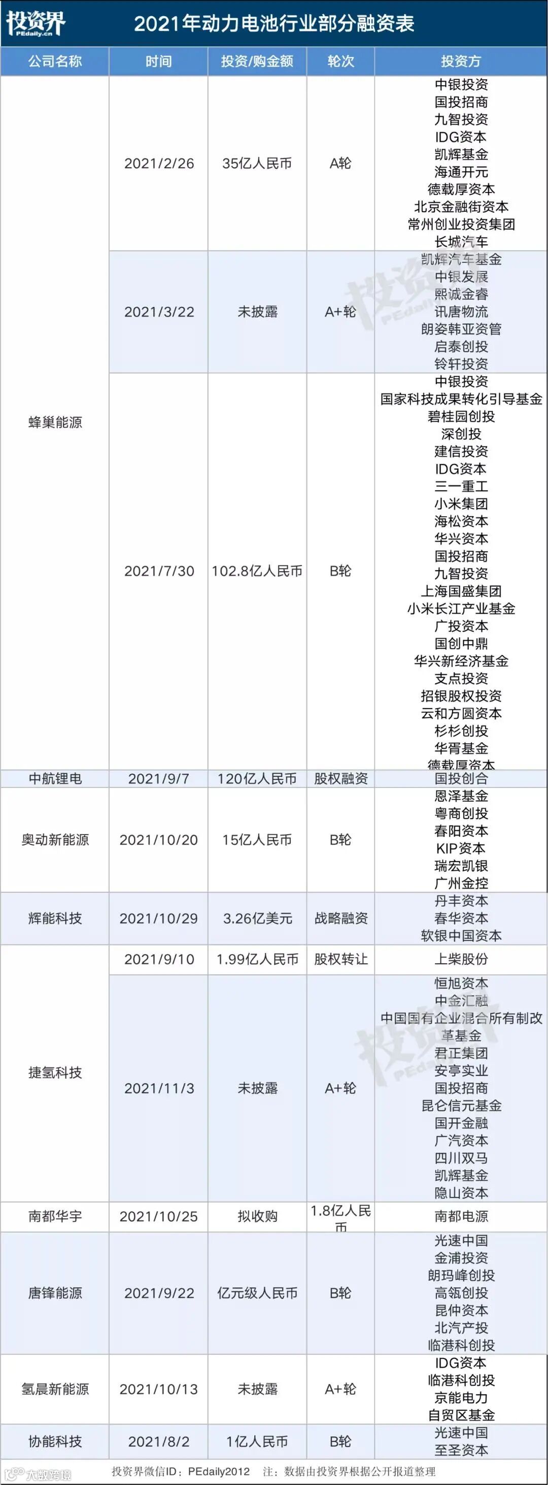 “这次电池荒可能持续到2025年。新能源汽车厂商担心供应链受到影响,自然会跑到上游投资一些动力电池公司。而且,他们更担心电池产能被少数公司握在手里,而失去了议价权。”一位长期关注汽车领域的投资人点出了其中的门道。因此我们看到,每一笔电池融资背后都有一群产业巨头的身影。