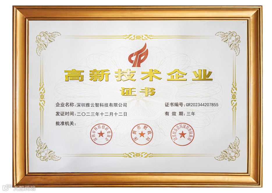 近日,雅里数科集团旗下子公司深圳雅云智科技有限公司(以下简称雅云智)经过严格的评审,成功通过深圳市科技创新委员会、深圳市财政局、国家税务总局深圳市税务局的联合认证,获得“高新技术企业证书”。