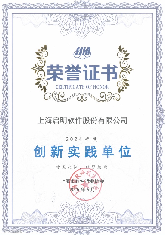 会议对2024年度为协会发展给予重点支持、做出突出贡献的会员单位进行了表彰。为了激发行业创新活力,表彰推动行业技术革新以及创新发展等方面发挥示范引领作用的企业,上海市软件行业协会设立了“创新实践单位”评选。启明自1988年创立以来,始终践行求真务实、发展创新的理念,不断地在实践中创新,被成功评选为高新技术企业、2024上海软件核心竞争力企业(创新型)、专精特新中小企业,证明了启明软件长期具有较强的技术创新能力和技术开发能力,也拥有较高的技术水平和产品技术含量。启明软件凭借过去一年在推动行业技术进步、助力产业生态建设的亮眼成绩,成功获评“创新实践单位”称号。