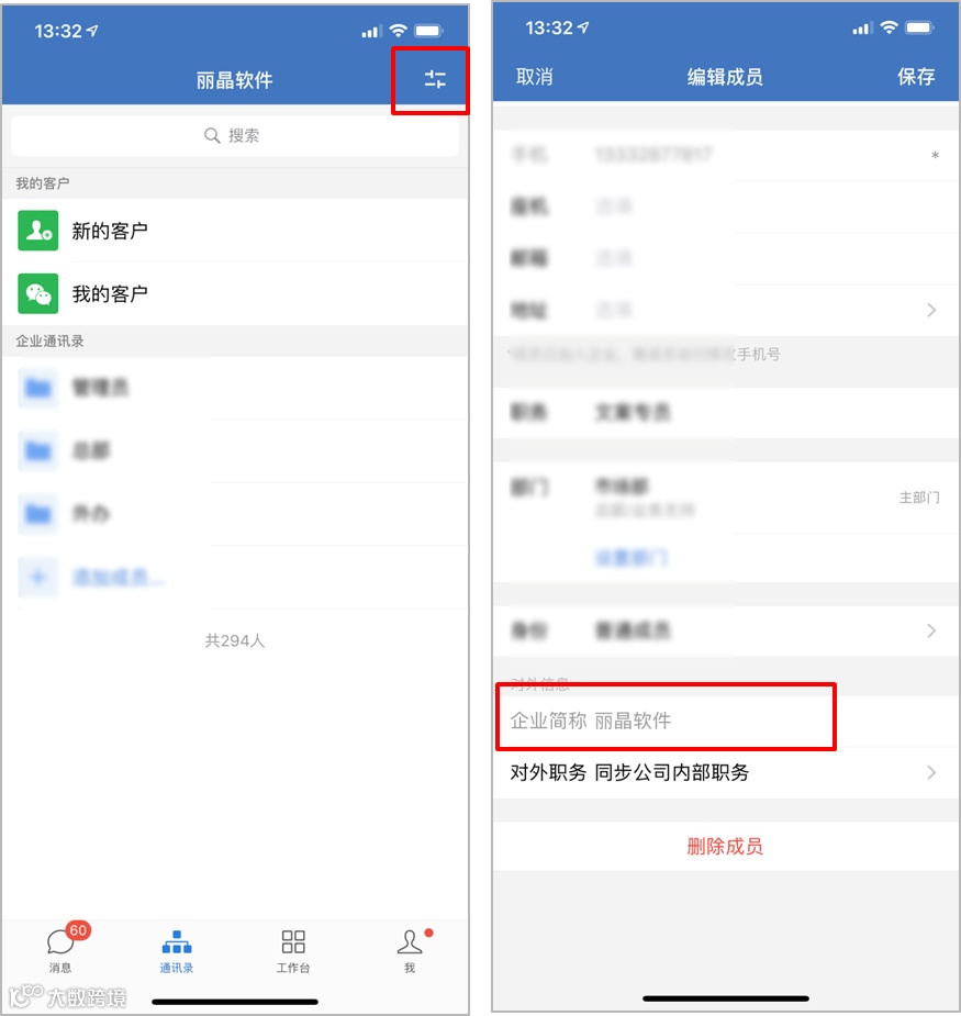 管理员打开企业微信App,进入【通讯录】页面。如图所示,点击右上角的"设置"按钮 ,进入“编辑成员”页面,在【对外信息】一栏,即可为不同员工设置不同的企业简称。