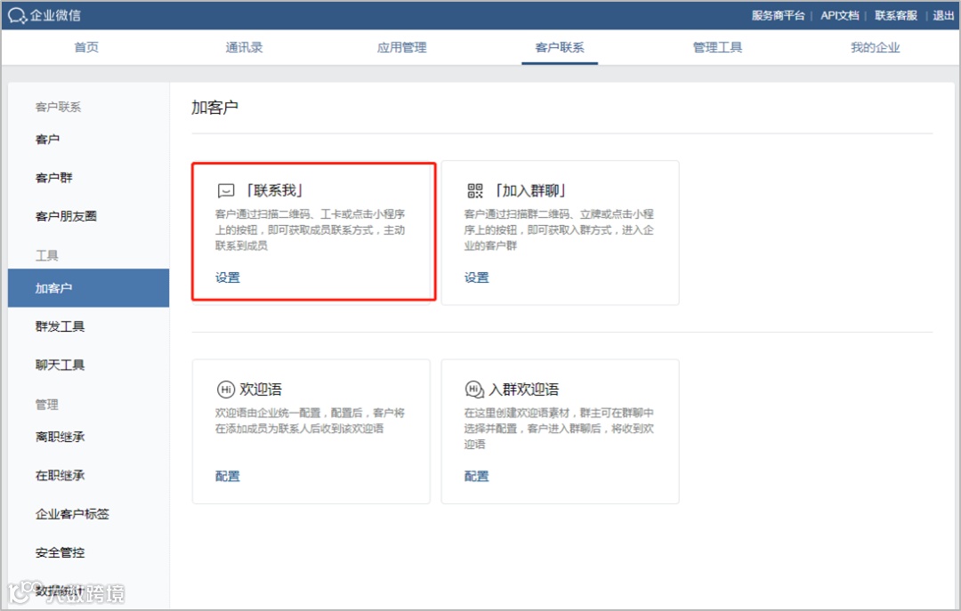 管理员登录企业微信管理后台 ,在「客户联系」 - 「加客户」页面, 点击「联系我」,然后选择“通过二维码联系我” 创建活码。