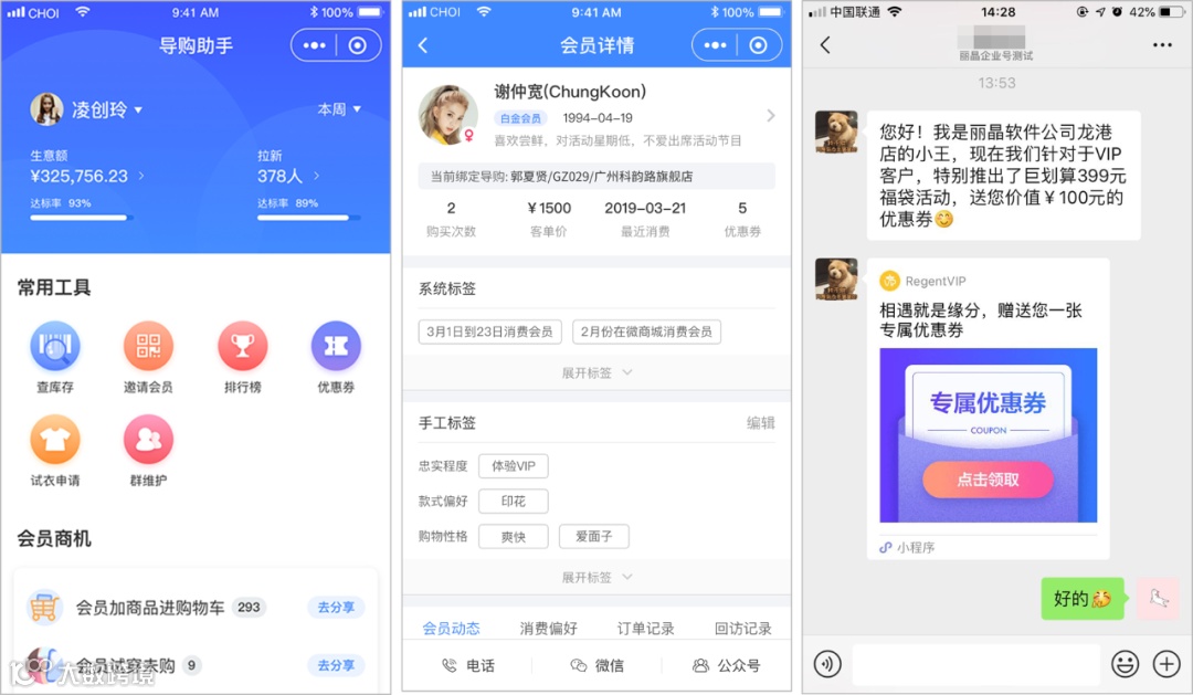 添加客户后,使用导购无忧还可以给客户打标签、备注,丰富会员画像;基于会员画像在线推送商品、优惠券和活动;配合“加购、试穿、券到期”提醒,帮助导购把握商机。