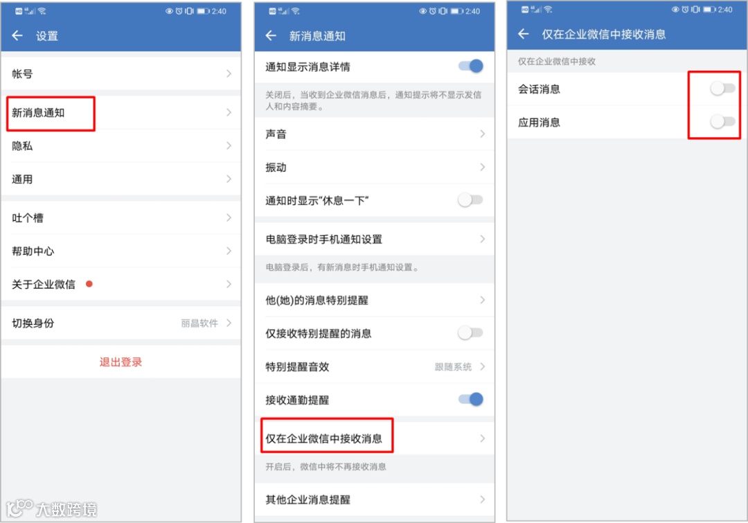 员工登录企业微信APP -「我」 -「设置」 -「新消息通知」 -「仅在企业微信中接收消息」。