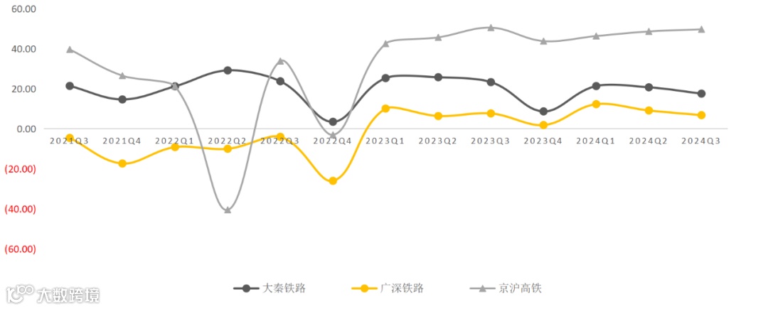 从2023年收入体量看,大秦铁路(810亿元)>京沪高铁(406.8亿元)>广深铁路(261.95亿元)。