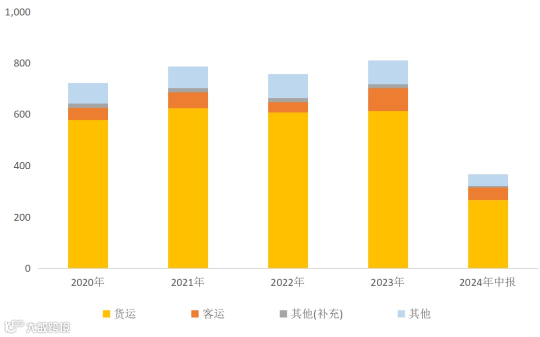 2024年中报,货运收入占比72.5%,客运收入占比13.4%,其他业务占比14%。