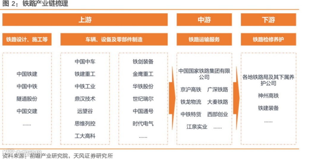 中游——铁路运输运营公司,主要企业包括国家铁路集团、中国铁路物资、中国中车、京沪高速、中铁物资、大秦铁路、广深铁路等。
