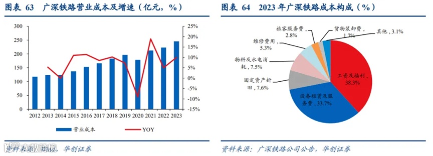 广深铁路——公司设备租赁和人工占比较大,2023年,公司设备租赁及服务费、工资及福利分别占比33.7%和38.3%左右,合计占比约72%。